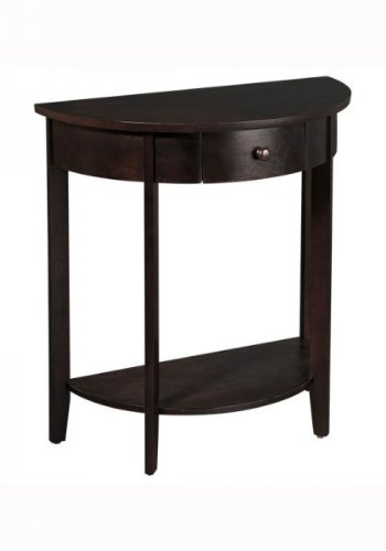 Finish/Color :Espresso The Madison Hall Console Table is radiant with a vintage cosmopolitan vibe that is very much transitional in its appeal for different decors. Distinguished by its sleek edges, angled legs and half-moon cabinet and table top,it has a very particular character. Features: Solid hardwood construction Timeless design complements most any dcor Beautiful finish on select veneers and solids Handy storage drawer for accessories Lower shelf for additional storage Distinctive multi-step finish process Easy to assemble Made in China.../ Espresso Console Table / Entry Table
